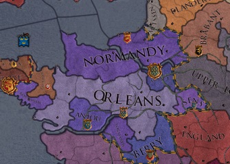1360年、帝国領内に身を寄せていたブルゴーニュ公の次男Amalric de Bloisの請求権を主張し、Dietmar大帝はフランスに宣戦を布告した。 当時皇帝はまだ14歳であり、実際の軍略はすべてErmengau de Commingesが執っていた。   dijon.jpg   神聖ローマ帝国はブルゴーニュ公領を獲得したが、この微妙なバランスはその後、数十年間に渡り変化の無いままで経過していた。 事態に動きがでたのは、1397年を迎えてからだった。   前オルレアン公の甥にあたるBarthelemi de Sensはオルレアン公位の請求権を保持したままアキテーヌ王国領北部に司教領を獲得していた。   orleans.jpg   この時代、フランス王国領内は、オルレアン公領とノルマンディー公領に大きく二分されるようになっていた。 Barthelemiのオルレアン公位への請求権を主張してフランス王国に攻め込んだ神聖ローマ帝国は結果として、 フランス王国の法的な領域の大部分を支配することとなった。   before.jpg after.jpg   Dietmar II世がフランス王位を簒奪すると、フランス王の支配下にあった各公爵は、それぞれ一時的な独立を得た。 彼らのうち前フランス王のヴァロワ公Mathieu II世以外の諸侯たちは1398年には神聖ローマ帝国への臣従を誓った。