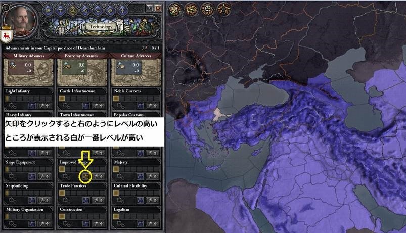 他の技術レベルの状況は矢印以外の技術をクリックして確認できます