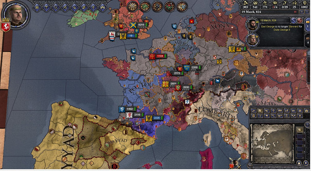 西暦824年3月19日現在の西欧の地図 フランスは、とてもカラフルになっています。 有力な勢力は、現在我がケント公と同盟している東フランク王国・東フランク王国と戦争中のトゥールーズ公国・ポワトゥー公国の三強に、上ブルゴーニュ公国・プロヴィンス公国が続いています。またノーフォークを盗ったSVIPJODも食いこんでおり、そのほかにも独立勢力が存在するなどさながら戦国時代の様相を見せています。 ウマイヤ朝はいつもどうり内戦中。なんか色が変わったけど。