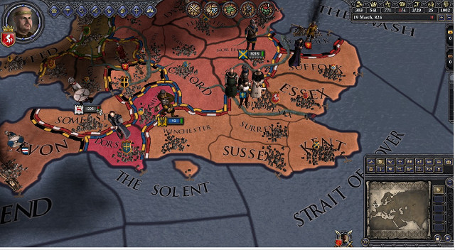 西暦824年3月19日現在のケント周辺の地図 ウェセックス王国が衰退しており、今後は北のマーシア・さらにその北のノーザンブリアとイングランド王位をめぐって争っていくことになるでしょう。 あと、ノーフォークはSVIPJODに盗られました。