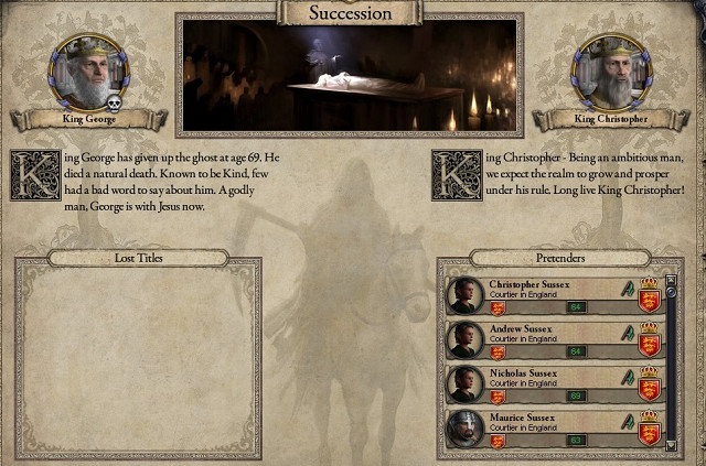 イングランド王ジョージ1世老王は崩御した。享年は70歳であった。 彼はその51年の治世の間に、ウェセックス王国とマーシア王国を滅ぼしイングランド王位を創設した。また晩年には城下町の開発も行い、今後イングランド王国が栄えていく礎を築いたと言っていいだろう。