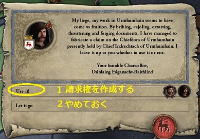 ここで間違っても5番make tributaryを選択しては駄目です。 (これは新DLCの属国システムで強制同盟を結ばせて上納金を4割納めさせるものです、あとどちらかの当主交代で同盟終了します。)
