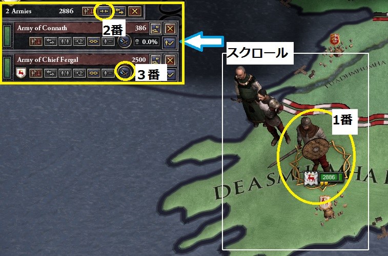 2番は2つの部隊の合体です まとめて移動できるようになります 3番を押すと略奪部隊になります、戦争していなくても他国から略奪できます(お金)