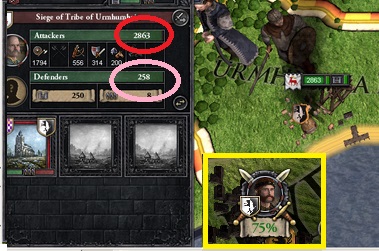赤枠のすぐ右上のボタンは強襲ボタンです、今の戦力差くらいなら強襲して終わらせてもいいですが、2倍の兵力差くらいで押せば痛い目にあうでしょう(多分)、気をつけてください。