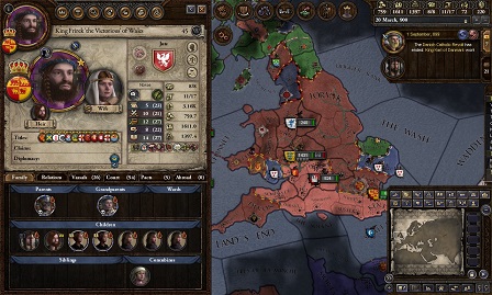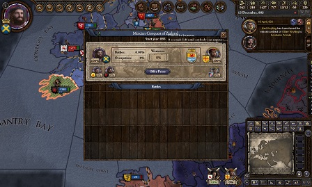 その結果、領土は上図のように拡大した。我がマーシアはイングランドの大部分とウェールズを治めるブリテン島でも屈指の勢力になったのだ。 しかしながらデンマークがウェセックスの征服に成功したことにより、イングランド南部に広大なデンマーク領が誕生してしまった。 現在マーシアの治めるのはイングランド王国De jure領域の48パーセントである。 あと1つプロヴィンスを得ればイングランド王に即位できるのだ! ならば話が早い。何も勢いにのるデンマーク王とわざわざ戦う必要などないのである。