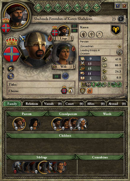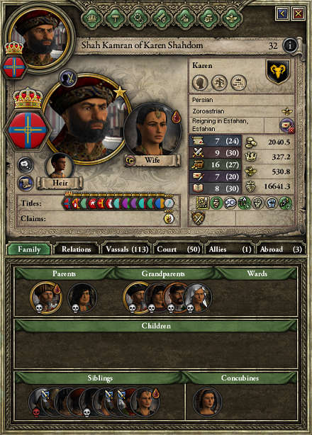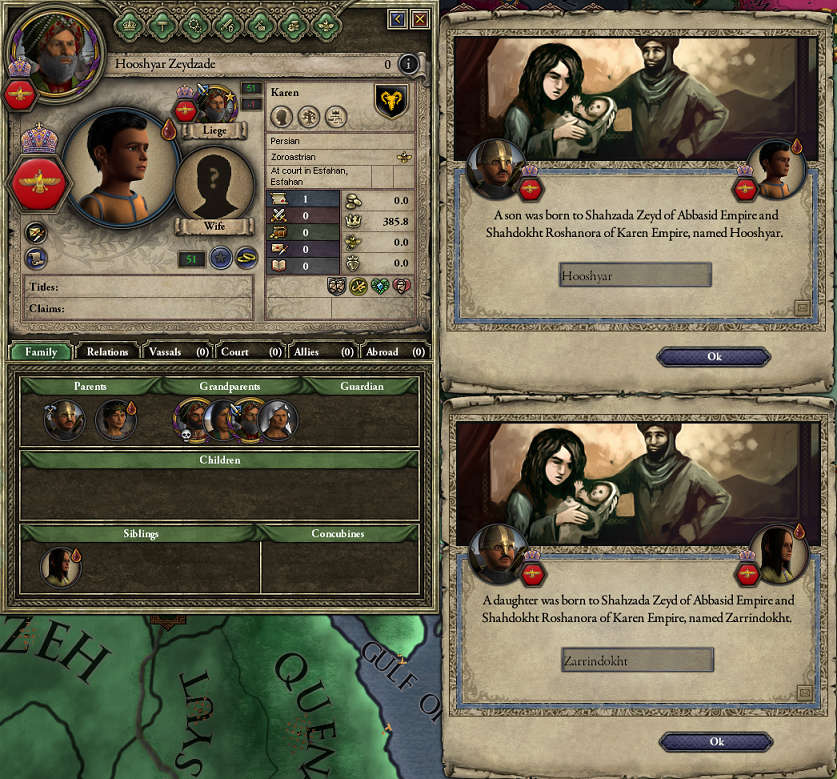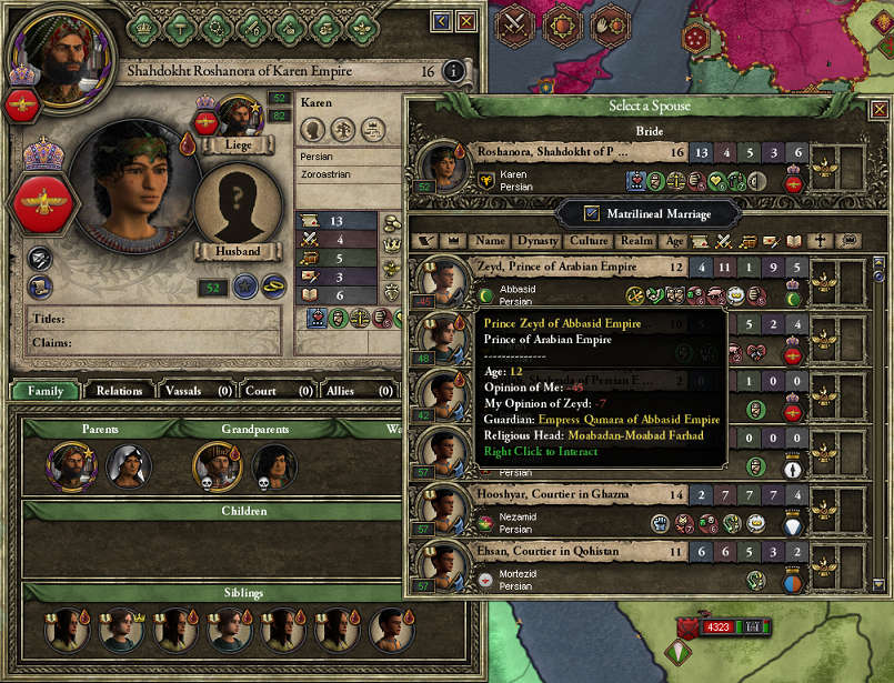 解説を入れますと、サイイドとは預言者ムハンマドの男系子孫のみに与えられる特殊なtraitです。このtraitを保つ場合、ムスリムからのオピニオンが+10されます。 ただしお互いにイスラム教である必要があるので、ゾロアスタープレイの今回は効率面での意味は特にありません。 しかし筆者がこのAARを始めた動機でもあるため、是非ともカレン家の血筋にサイイドを取り込みたいと思います。