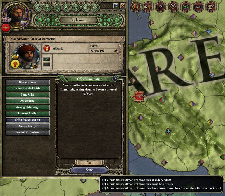 カリフから領土を回収し続け、ビザンツの内戦に介入。 時にエジプトやハーシム家を殴りながら、サイイド未成年男子の改宗に務めたKarmanは、治世の晩年に自らが救世主であることを宣言することを決意しました。 サオシュヤントの条件はペルシア帝国ダジュール内の"完全な"支配なので、独立男爵などの見落としに気をつけましょう。