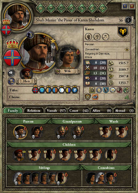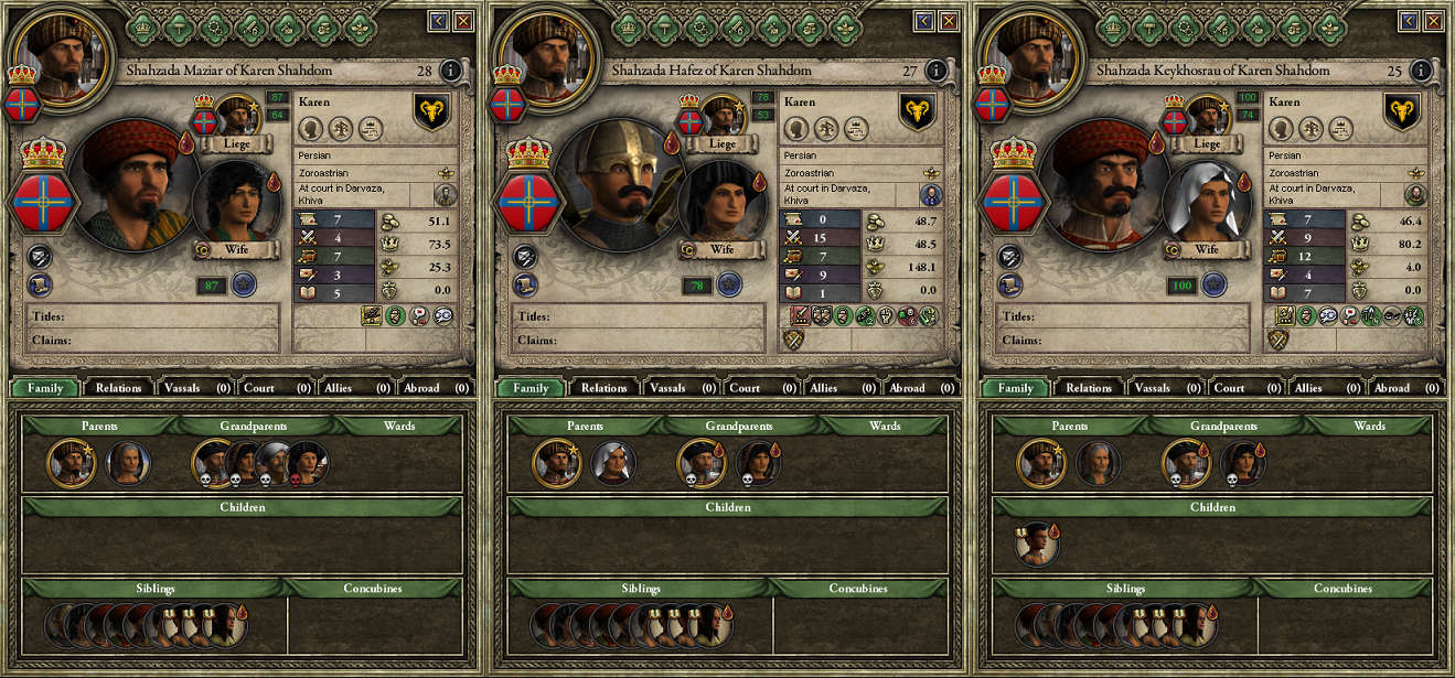 一族に領地はまだ配らないため、部屋住み&子供ができにくい状態ですが、この男子数ならば断絶はそうそう無いでしょう。 ゾロアスター教の近親結婚システムはブリーダープレイに向いているため、あえて宮殿に一族を囲っておく意味もあるとは思います。