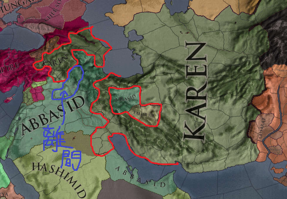 933年には、青枠のようにアッバース朝を四分五裂に追いやります。 これにより4~5公爵領分の兵力が無駄となると同時に、こちらはバグダッド周辺などの豊かなメソポタミア地域を獲得。 アッバース朝は当主の低外交力が災いしてか、近隣勢力と順番に殴りあっており、旧領を恢復する力はもはや無いに等しいです。カレン家の動員力は20000を越えました。