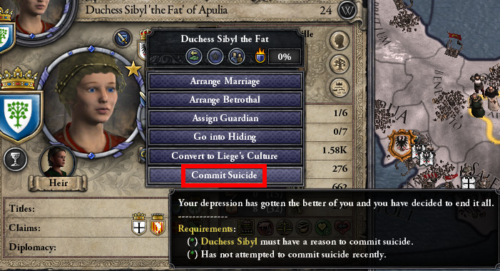 プッリャ公シビル: さっそくアルマン卿を王位に推す派閥に入ったわ。 …って、あなたは派閥に入らないの? ベネヴェント公ウィリアム2世: いや、まあ、もう少し情勢を見極めてから…。(Craven)