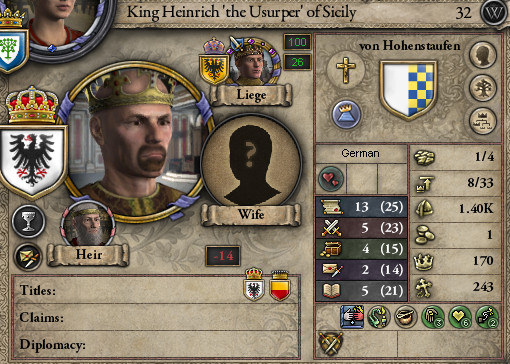 シ: 二人目を妊娠したわ。 ウ: いいねー。オズバーンを産んだことで弾みがついたのかな? ところで、シチリア王ハインリヒがアイユーブ朝のトリポリタニアへの聖戦を宣言したんだ。 私も指揮官として出征するよ。