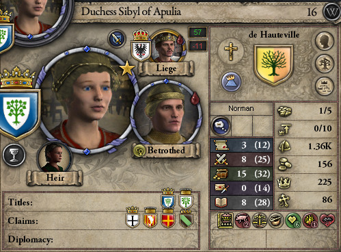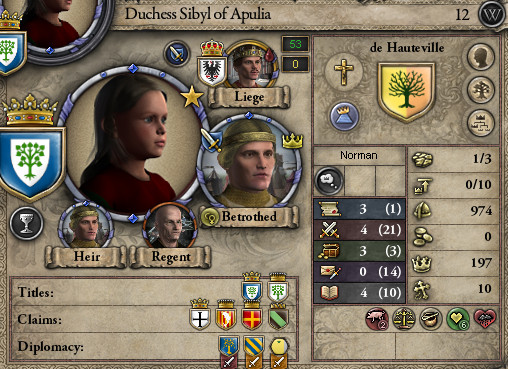 プッリャ公シビル: パパの無念はあたしが晴らす! 母・ナバラ王女ブランカ: まずはしっかりお勉強なさい。 あなたは将来、王弟のベネヴェント公ウィリアム殿下を婿に迎えるのですから。