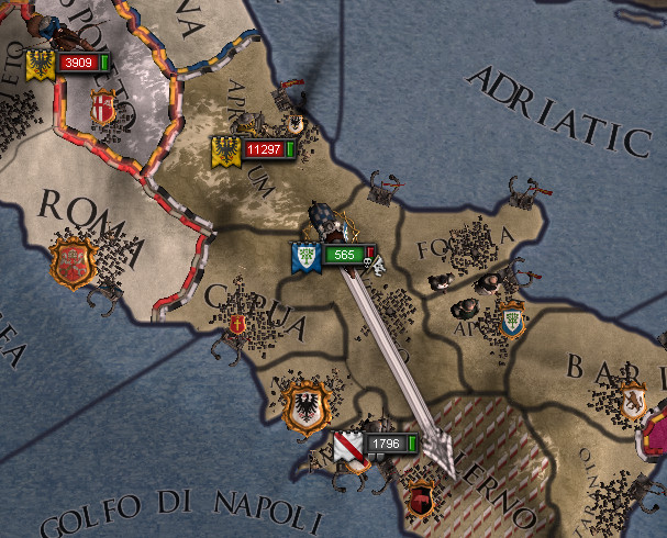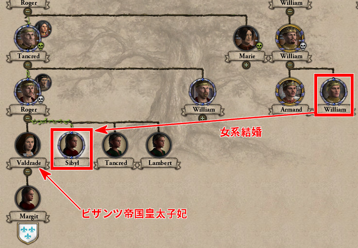 ウ: 直轄領1? シ: そう。彼は首都のナポリを抑えているだけ。 ナポリとアブルッツォ以外はオートヴィル家の公爵が治めているわ。 前国王アルマン様もカプア公として2プロビを所有。 ウ: まあでも、これから領地没収の嵐が吹くだろう。 シ: そうかもね。 ただ…、史実でもオートヴィル朝は神聖ローマ帝国に滅ぼされたけど、史実と大きく違うのは、神聖ローマ皇帝がシチリア王を兼ねていない、ということね。 神聖ローマ皇帝とシチリア王は従兄弟の関係よ。