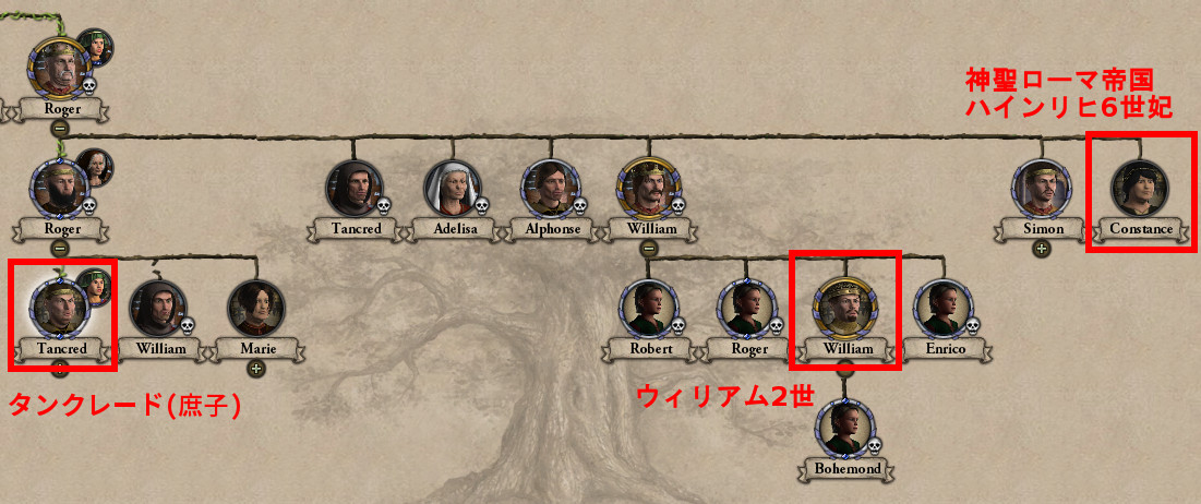 タ: 私はオートヴィル家の庶子の家柄。シチリアの初代国王ロジャー2世(ルッジェーロ)の長男ロジャーの妾の子だ。現国王ウィリアム2世(グリエルモ)は従兄弟。叔母コンスタンスは神聖ローマ帝国の王子ハインリヒ6世に嫁いでいる。 ご覧の通り王には嗣子がなく、史実では私が王位を継いだ。