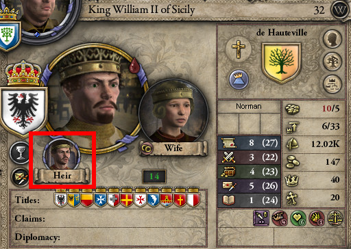 タ: ふう、荒れ果てていた庭の大改造が終わったぞ。なんだか管理能力も上がった気がする。ペナルティ無しで3プロビを領有できるよ! ロ: やったね、父さん! タ: おいやめろ。…さて、次は継承法を変えねばならん。分割相続制のままでは、お前の弟のウィリアムが独立してしまう。 ロ: 殺っちゃえば? タ: 馬鹿もん! …だが、継承法変更に必要な「統治10年」という条件は厳しいな。パパ、史実では1194年に死んでるし。 まあ、分割されても同じシチリア王国の封臣なんだし、受け入れるとしよう。