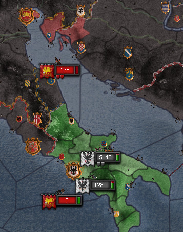 ロ: 野戦に勝利した後も、ベネチア軍はシチリア内の城を包囲していますが、王はそれを無視してベネチア本国へ向かうようです。 タ: もう大丈夫だな。では、お前は十字軍に参加するんだ。 プラス15の補正で、教皇のオピニオンをマイナスから脱することもできる。 とはいえ、それでもシチリア王の破門解除は取り合ってもらえなかったが…。