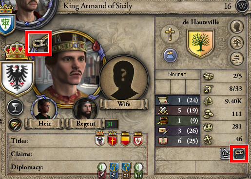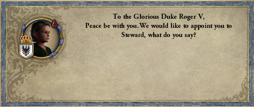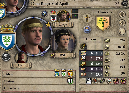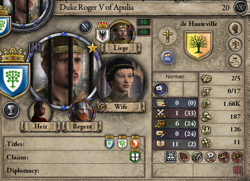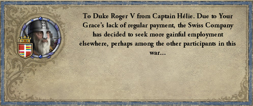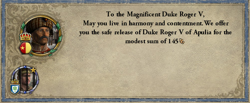 ロ: モーリタニアのスルタンが、アラゴンへのジハードを宣言したぞ。 妻: シチリア王もすぐに参戦を表明して、援軍を招集しましたね。 ロ: 実は今、宰相に命じてアンコーナの要求権を捏造させてるから、余計な戦いはしたくない…。 しかし、我らはノルマン傭兵の家系。率先して戦いに赴くのが宿命だ。 プッリャ公としても援軍を出そう。