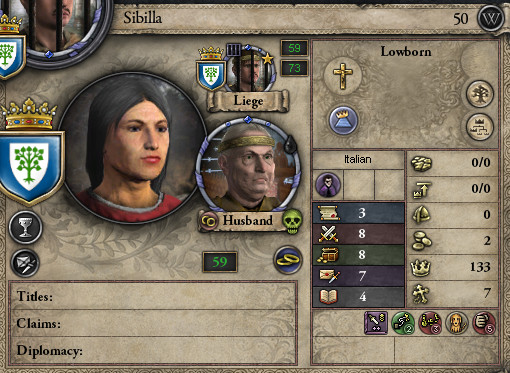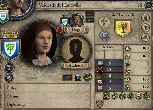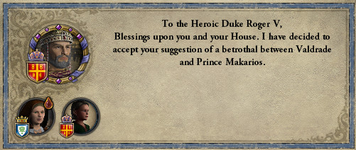 ロ: 同族結婚だが、又従兄弟以上に離れているから問題なかろう。 長女ヴァルドラーデはアルマン陛下に嫁ぎ、次女シビルは王弟のベネヴェント公ウィリアム殿下と女系結婚する。 シビルは女公として私の後を継ぎ、ベネヴェント公との間に生まれた子が、ゆくゆくはプッリャ・ベネヴェント公として領地を統合することになるのだ。 妻: なんだか、大それたことをしている気がしますわ。 ロ: シビルがベネヴェント公との男子を産んでくれれば、その子はオートヴィル家の男系嫡流となる。 別に、王位を狙ってはいない。 ただ、妾の子の家柄と言われたくないだけだ。 妻: 分かりましたわ。あなたがそこまでこだわる(Stubborn)のでしたら。 ロ: 以前から打診はしていたのだ。 国王が幼少で嗣子がなく、現在の後継者はベネヴェント公なので難しいかと思っていたが、なんとか承諾してもらえたぞ。 この1年でシビルに不利なトレイトがついていないことも確認できたので、正式に婚約だ!