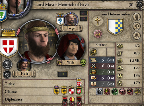 母: 神聖ローマ皇帝フリードリヒ1世「赤髭王」は死去。 史実では皇帝ハインリヒ6世として私たちを苦しめた皇子ハインリヒは、イタリア半島の付け根にあるパヴィーアの大市長に収まってるわ。 ロ: え!?