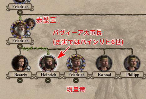 母: 帝位は彼の弟が継いでフリードリヒ2世と名乗っているわ。 史実のフリードリヒ2世はハインリヒ6世の息子だから、それとは別人ね。 ロ: 何があった、ホーエンシュタウフェン家…。