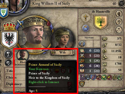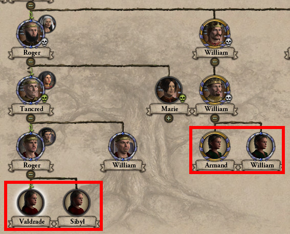 母: 史実ではあなたの父タンクレードよりも早く亡くなったシチリア王ウィリアム(グリエルモ)2世はご存命。 嫡男アルマン王子も誕生して、後継者に据えられたわ。