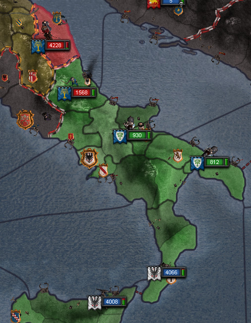 ロ: 代替わり早々、アンコーナとの禁輸戦争が始まった。 1プロビ相手なら楽勝だと思ったが、敵はどうやら傭兵を招いたようだな。 それでも数ではシチリア軍が有利だが、我が方は分散している。 一応、援軍を出すとしよう。