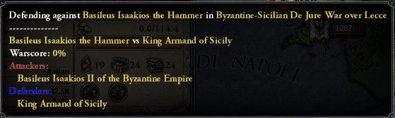 妻: あなた、大変です。 パヴィーアの大市長もシチリアに宣戦しましたわ! ロ: 史実では皇帝ハインリヒ6世としてシチリアを襲った、あの野郎か! 大叔母コンスタンスとの間に生まれた息子・ハインリヒ(架空の人物)が持つシチリア王の要求権を使ったのだな。 妻: ただし、パヴィーア単体としての戦争で、神聖ローマ帝国は無関係のようです。 ロ: ズコー なんだそりゃ。 ならばビザンツに専念していいな。