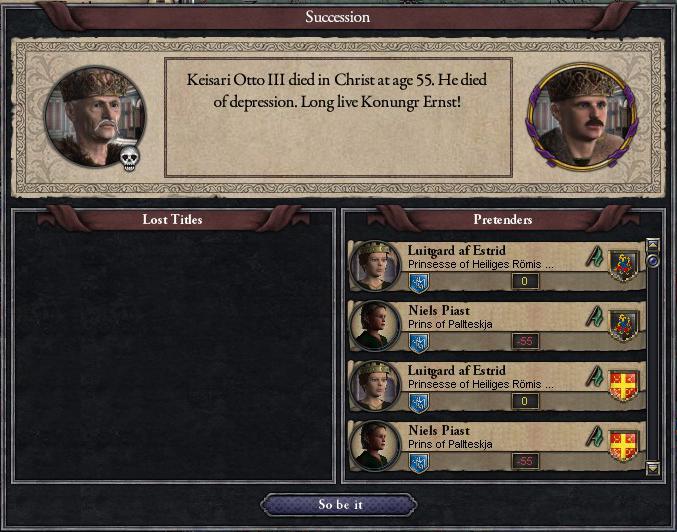 9月23日、モルドヴァとモラヴィアの王、ホルスティーンの公爵プリドビョルンが薨去した。83歳の大往生であった。 ヴァルデマ聖帝以来四代にわたって仕え、帝国元帥として代々の皇帝を大いに支えた。 王位と公位は孫のプリドビョルンが継承した。 &ref(): File not found: "006.jpg" at page "AAR/デンマーク年代記/巻十六 オト大胆帝 1473~1487";