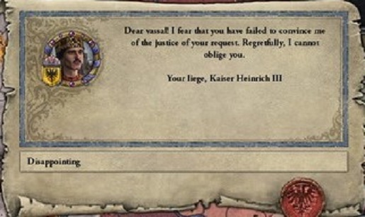 私の気心のおける部下たちは皇帝にそのことを奏上してみてはどうかと提案してくれた。さすがにそれは不遜であると断ったよ。 しかし、一度夢見ると思いは日増しに強まるもの。 公爵になりたいという願望を抑えることはできず、1072年9月末、私は上ブルグンド公爵位を求める奏上文を都へ赴く使者に託した。 10月初めに皇帝より返答が届いた。