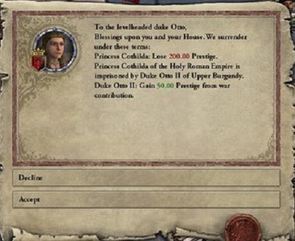 私の回答に対し、皇帝からの返答は「上ブルグンド公の言う通りだ。すまなかった。」というものであった。 それ以降、皇帝より娘のことに関する要求は一切無かった。 ただ、皇帝も内で思うことがあったのだろう、私が都に参集を命じられることもそれ以降無かった。 結局私が死ぬまで皇帝とは疎遠だったなあ。 まあ、コチルダを死ぬまで牢から出さなかったから当然といえば当然だが、ちょっと大人げないよな。