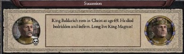 ワシはバルダリッチ。王の寝所を監視させていた部下より、先ほど王が死んだという報告が届いた。フハハハハ、男爵上がりのエメリッチよ、しょせん貴様には王など荷が重すぎたのじゃ。 これで、晴れてワシが王じゃ。法によってこれは決まっておることなのだから誰も異議は挟めぬぞ。たとえそれが皇帝であってもだ。