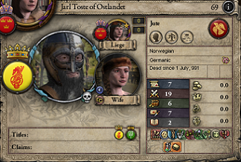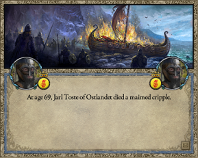 人生の大半を戦場で過ごした、ユート氏族最強の戦士・トステ。 生粋の前線指揮官という印象があるが、一時は野心に燃えて帝国内での領土争いに積極的だった事もあり、戦場から自領土へ指示を出して拡張させる事もしていた。 元はメクレンブルク大族長であったが、そうしてオストランデも獲得し、その後にカルルに諌められてメクレンブルク大族長位をアヌンドルに譲っている。 それはカルルとトステの友情を深めたとされているが、フィンランド王位がアヌンドルに与えられた事や私闘禁止法の施行は、トステを恐れての事だったとも言われている。