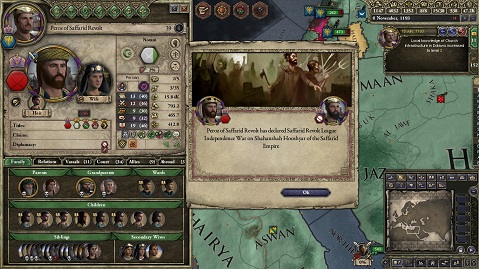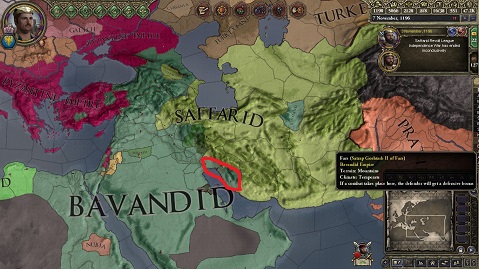 西暦1193年11月。Saffarid朝を大きく揺るがす出来事が起きた。 インドとの境を守る要衝の領主、Saffaridの皇帝の信頼も厚く王号にも封じられ「ペルシア皇帝の藩屏」と称された、本来なら皇帝一族に最も恩を感じていなければならないNotaniの一族(かつてペルシア封臣時代のBavandid家にインド攻めの援軍を求めたこともある(第10話参照))が反旗を翻したのだ。