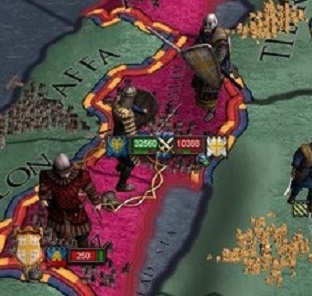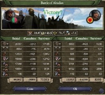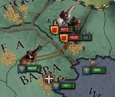 Ilkahanateとの戦に敗れたアラビア帝国は傭兵を大量に雇用し、すぐさま取られた土地の奪還を目指して再戦を挑んだ。 占領したばかりであり城壁のもろいこれらの土地は、開戦後即座に侵攻してきたアラビア傭兵軍による強攻により、次々と落とされ、戦勝点は瞬く間に100となった。