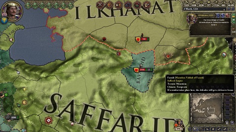 相次ぐ我々への敗北により求心力を大幅に低下させたSaffaridの皇帝はクーデターにより失脚、新たな皇帝には前皇帝の私生児Dariushが即位し、Darim朝の樹立を宣言。これにより、Saffarid朝は一時的に滅びることとなりました(後に帝位を取り返し、復活する)。