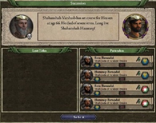 ペルシア王はBavandid家にとっては家訓ともいえるペルシア攻略の先兵となる重要な地位である。 また、その統括地域は豊かなペルシア一帯に及び、動員兵力ではアラビア帝国の獅子身中の虫・アラビア王に次ぐほどの勢力を有する。 この地位を自らの後継者に託したことにより、皇帝とその直系の帝国内での力はさらに増すこととなった。 以後、ペルシア王位は皇太子が就く地位として、帝国内の4王に対抗する皇帝の藩屏としての役割を担う(皇太子が就くという制度が形骸化するまでの間だが)。