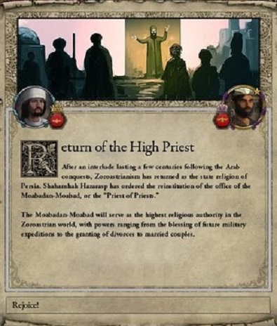 ゾロアスター教によるペルシア帝国の再興に、ペルシア中がお祭り騒ぎとなった。 ペルシア帝国が再興されたのなら、ゾロアスター教も組織としての体系を取り戻さねばなるまい。 Hazaraspは全ゾロアスター信徒を統括する宗教指導者として、新たに大神官を設けた。