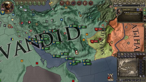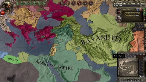 以上より、アラビア帝国を一時的に手放すことにしました。 この後、再びアラビア帝国を吸収するかは、ゲームの展開に任せます(もう完走していますが、ネタバレになるのでどうしたかは言えません)。 新生Bavandid帝国の今後にご期待(?)ください。