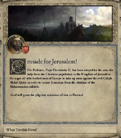 西暦1045年。ローマ教皇はもう何度目かはわからない、聖地エルサレム奪還の十字軍を発令した。