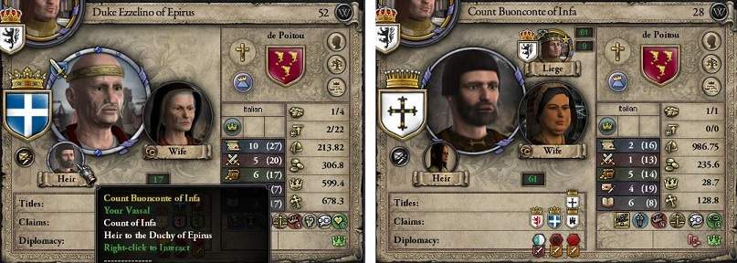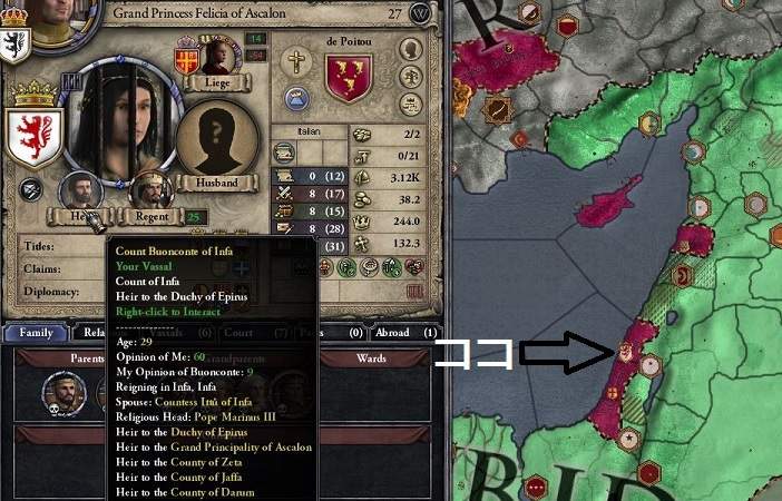 フランス発祥のポワトゥー家が支配するエピルス公国、公爵の跡取りが、モロッコで伯爵をしている我が家臣の1人になっていたのだ。 実はこの公爵、子どもが長男1人しかおらず、その子が齢23にしてカラトラバ騎士団入りして相続権放棄。