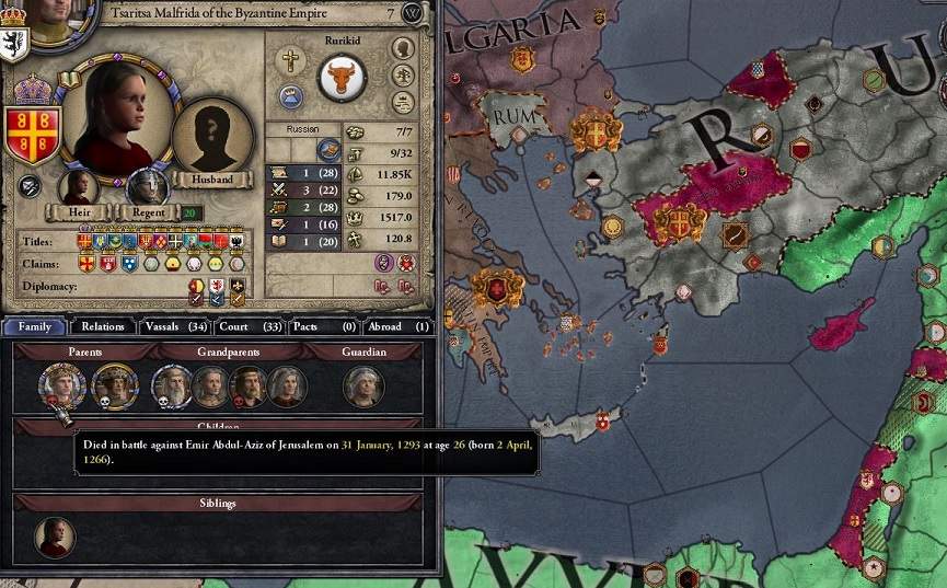 先代のビザンツのツァーリ・ヴォイスラフ1世は、26歳の若さでイスラム勢力との戦いの中、一人娘を残し戦死。 それに先立つこと5年、妻であるキプロスとエルサレムの女王エグランティーヌは、一人娘を産んだ直後、産褥死していた。