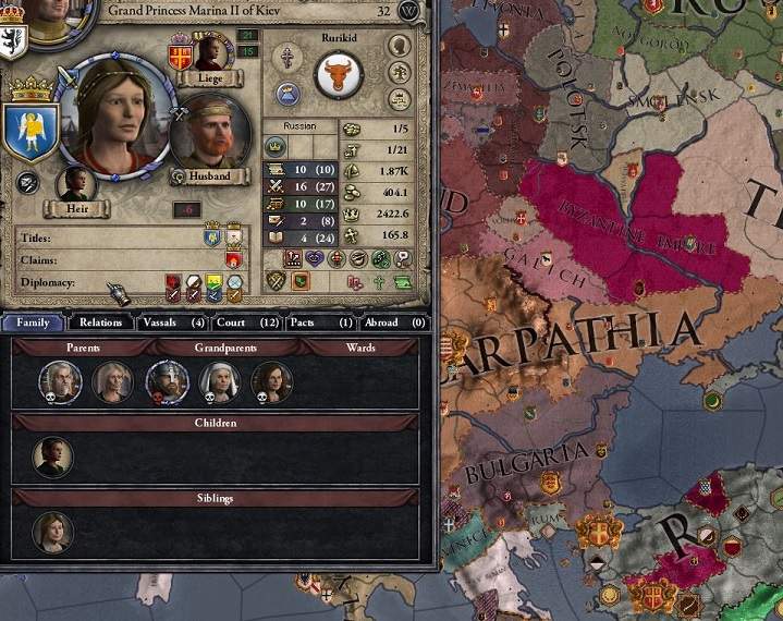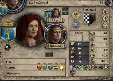 即位して少しした後のステータス。エルサレムに巡礼した際、「慈善」「忍耐」「狂信的」の3特性を得て帰還。一気に外交能力が7まで伸びた。 その後、外交成長イベントが起こって見事8に到達。成人時の8倍である。 が、更にその後「嘘つき」の特性をイベントで頂き、そう思ったとたん「好色」が消え・・・と、怒涛の勢いでステータスが上下し、こうなった。