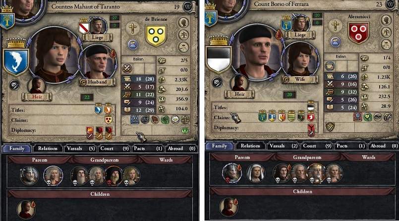 ブリエンヌ家のマオー女伯。外交18管理11とやたら優秀。「貞節」かつ「同性愛者」なせいで子供ができるか心配だったが、結局合計4人も産んでいた。 フェラーラ伯ボルソは正直無能。彼に跡を継がせるような事態にならなくてよかった。