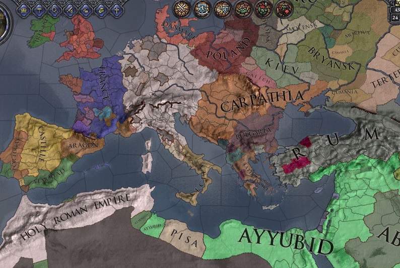 レオン王国がカスティリャに継承で吸収された。 大分裂したイングランドでは混乱が続いている。一領伯家は次々滅んでいるが、イングランド本体では年中行事のように反乱が起きている。 ルームセルジュークはグルジアも叩き潰し、黒海岸まで勢力を広げた。アイユーブ朝は相変わらず盤石。 なおこの時点でシーア派はほぼ絶滅。東方正教も死に体になっており、世界の宗教はカトリックとスンニの二大巨頭に絞られている。