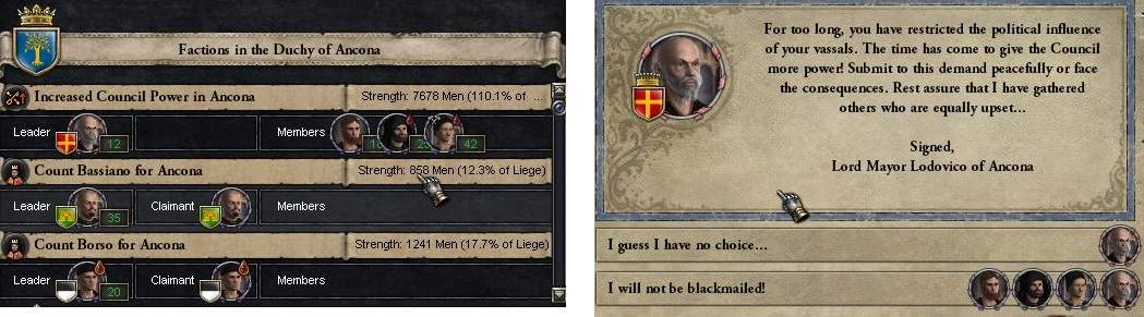もっとも、軽く10000以上を動員できる今のアンコーナ公にとって、7000程度の反乱ならばたいした脅威ではない。 反乱軍を各個に撃破し、軽くブチのめし、2年ほどかけて余裕で鎮圧。1市長3伯を牢に投げ込んだ。