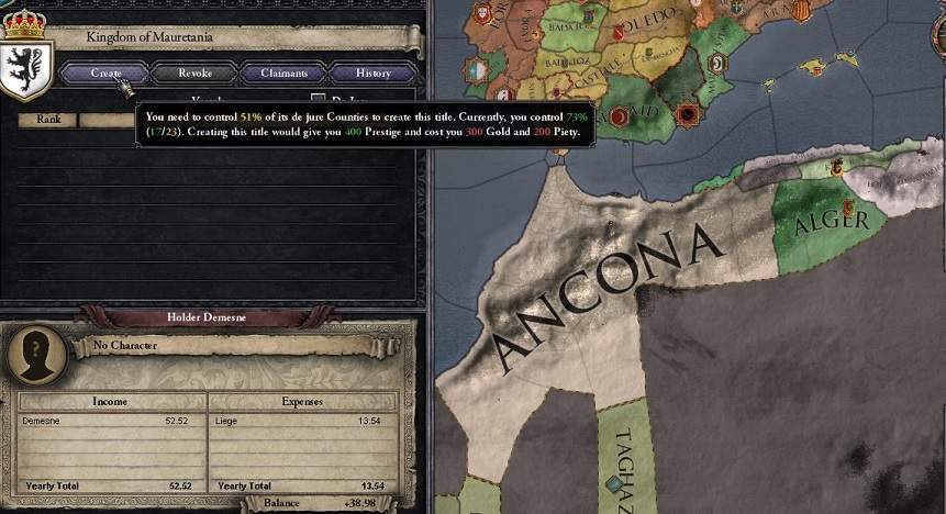 まあ、2州程度削られたところで、アルジェ内陸はド貧乏、別に大して痛くはない。 モーリタニア王号を名乗るのに十分な州数も確保しているし、 元から持っているアンコーナ公号に加え、トレムセン公号を創設して条件を達成。
