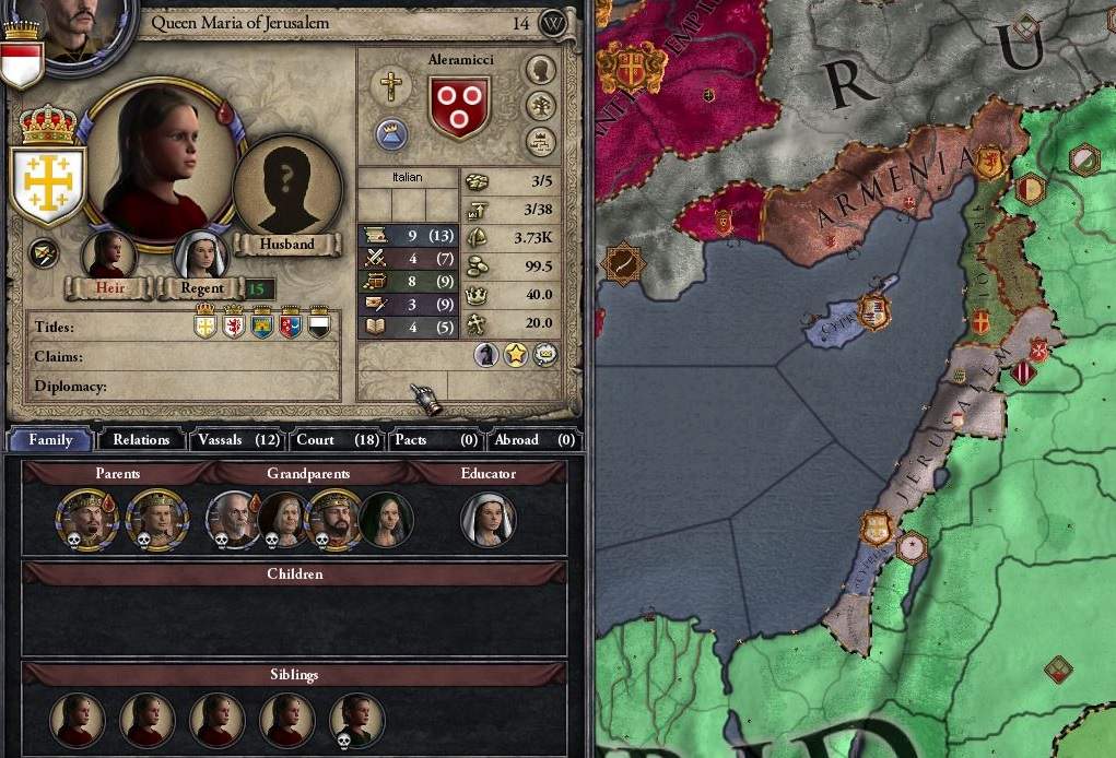 アレラミチ家のイスラエル女王マリア。 なおこの後通常結婚で、リュジニャン家のキプロス公の旦那を取ってしまったため、アレラミチ家は断絶。畜生。