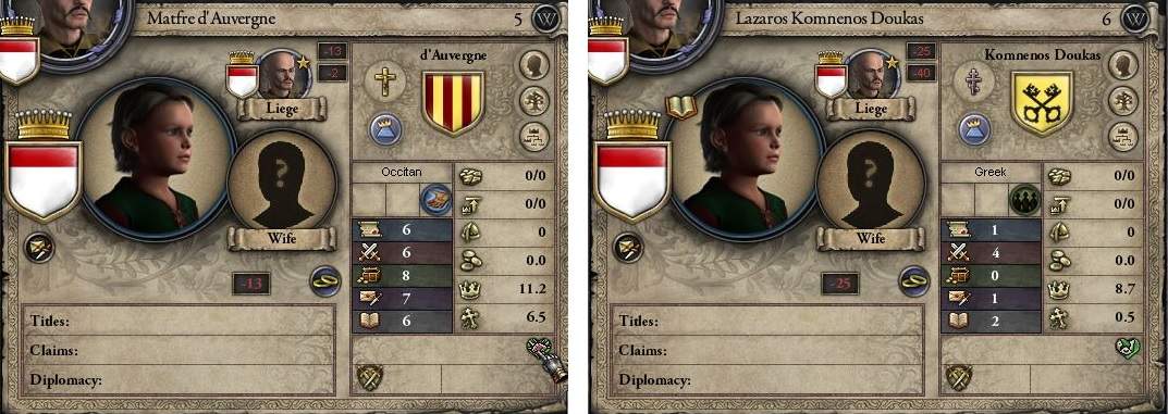 グリエルモは臆病でギャンブル好きといういかんともし難い性格だ。これだけで封臣の評価にマイナス10が付く。辛い。 ステータスもお察しとしか言えない。正直凡の下と言う他ないレベルだ。 また、テッサロニキ公への強い請求権を持っている。