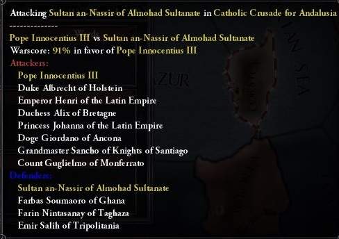 1220年には戦勝点は90%に到達。しかし、既に野戦で稼げる戦勝点は75%の上限に達しているのにも関わらず、 ラテン帝国軍は、逃げ回るムワッヒド軍をひたすら追撃し続けており、土地の占領に全く取り掛からない。 他の諸侯軍は消耗しきるか、本国情勢の変化によって撤収するかしており、占領に当たっている軍がほとんど存在せず、 結果、戦争がいつまで経っても終わらない、という、どうにもならない頭の悪い状況が続いていた。