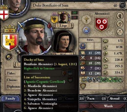 選挙制に改正したことで、継承者をこちらに指定することが出来るようになった。ここで2つのアレラミチ家を統合する……というのも考えたのだが。 スーザ公が分割相続になっている、というのが引っかかり、止めにした。 ボニファーチョは既に40歳。仮に今すぐ継承したとしても、相続法を選挙制に変えられる10年間を生きながらえるか、少し自信がなかったのだ。 統合しても増えるのは伯領1つだけだし、まあ、またの機会もあるだろうということで、素直に嫡男に継承させることとした。